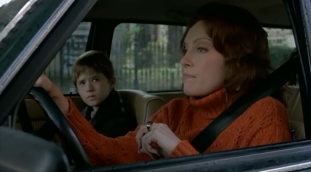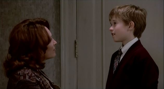 Cut into rock’n’roll, balloons and the entrance from the street. We are at kid’s party: It’s schoolmate Derrick’s birthday and Cole has been invited by the pressure towards Derrick from his mother, which is revealed by the boy to his pal later. Presently Cole is showing off doctor’s coin trick to another boy, the trick he first resented when sulking in an earlier scene. Grateful Lynn Sear is heard on the background: ‘He does not get invited to the places.’ Cole’s other schoolmate does not get fun out of the trick and Cole stays wondering about a balloon climbing up a stairwell. If he does hear something down to the table, I did not realize. Nevertheless, in front of growing tension among the audience, he starts climbing the stairs. Talking is heard, begging and threatening from a single door at the top. I did not observe if it’s a corridor to larger space, merely seemed a closet. A man’s voice begs his master not to punish him(now that I write this, a veritable theory of confinement lockup sneaks into my mind). A heavy oak door is open and beyond only blackness. A man’s voice first begs, then threats to let him out. We cut ominously in Tommy and his pal Derrick at the root of the stairs, Tommy bragging about his part in a telly commercial. They notice Cole at the stairtop. It’s inevitable; there is no friendship, there is ‘the freak’ and there is the creative yet dangerously bored duo. Little bullies implement ‘Locked in the Dungeon’ play, starring Cole; he is forced and locked behind the heavy door. He bangs door and screams; Coles mother either hears or ‘hears’ the muffled voices down amidst the heavy music and ascends stairs past another listening schoolkid. Other moms collect around the stairtop as mere staring extras as Lynn frantically tries to open the door. The lock suddenly switches, the screaming and banging is over and Lynn picks up his unconscious son from the closet.