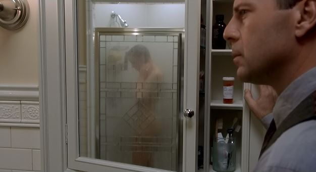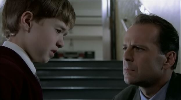 Upstairs we are presented a jubilation with Anna’s husband, Dr.Malcolm Crowe(Bruce Willis serious. You want Willis serious, unarmed and superb, this is it). Candles, grateful postcards from children and a handsome framed award from the City of Philadelphia ‘for Achievements in the Field of Child Psychology’ and we see the happy couple reflecting from the trophy.