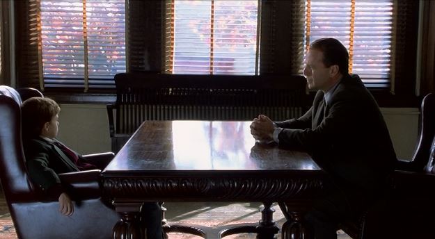 In the next scene Cole seems to be grounded in some sort of meeting, perhaps after being reprimanded, when Dr.Crowe finds him in a big leather chair. He’s sulking and replies to doctor’s attempts to comfort with a coin trick: ‘I didn’t know you were funny’; Adult sarcasm hits in the face. Why, isn’t he a little soldier? A child whose fate, like wartime soldiers’, is to grow old all too soon facing the same final theme but from another viewpoint? When the camera puts the odd pair at the table against windows blinds open, we can hear more clear mix of children playing in the yard, the air is bright and autumnal trees weave in the wind; a beautiful flash from the better side?