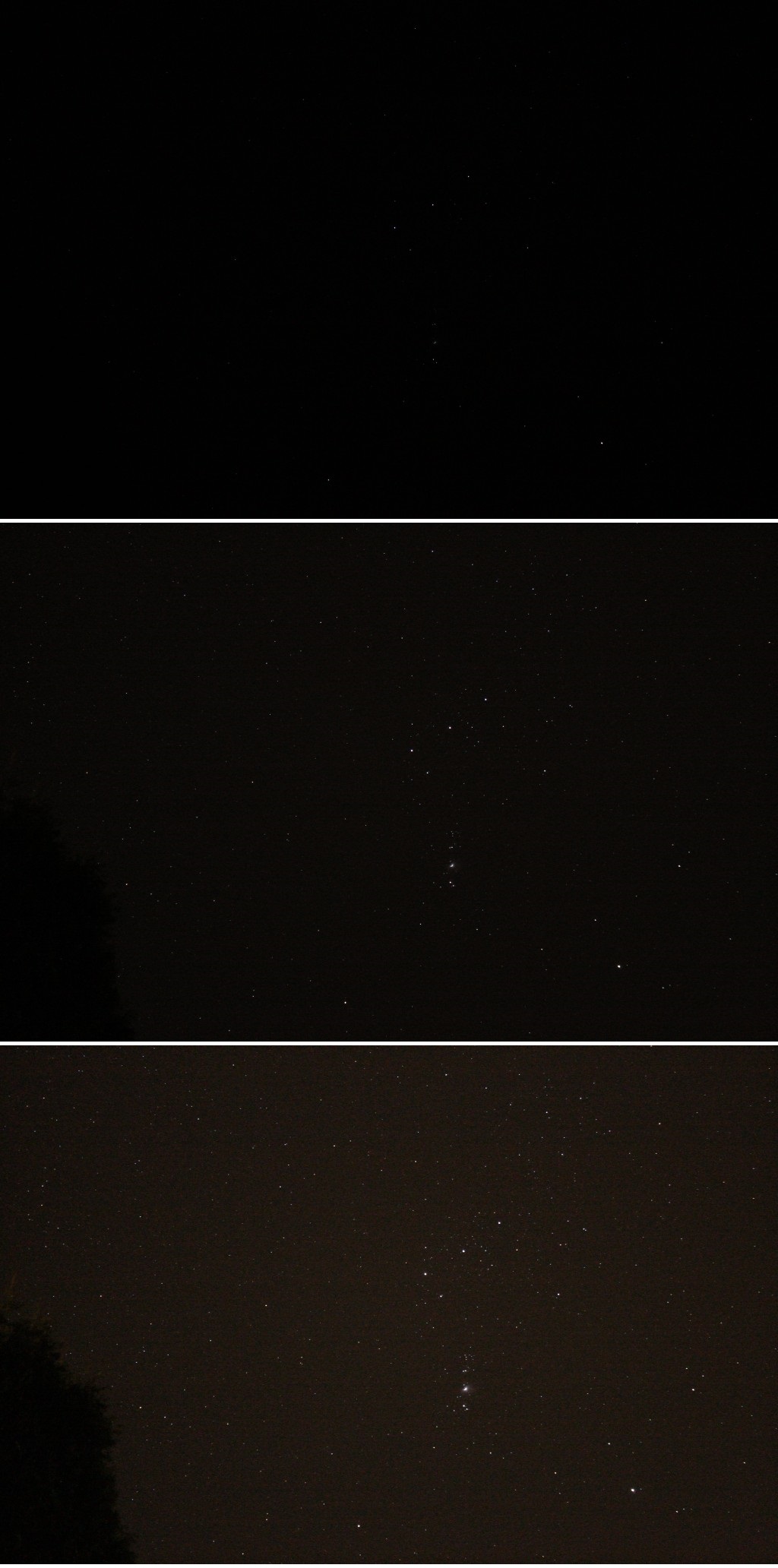 Three images of Orion constellation lower region, from ISO800 through 6400, f5.6, 2.5-5s exposures. In last image the ‘sand paper’ static is eminent, as is the M42 nebula and a tree.